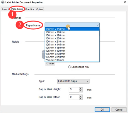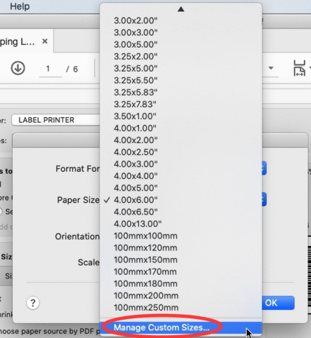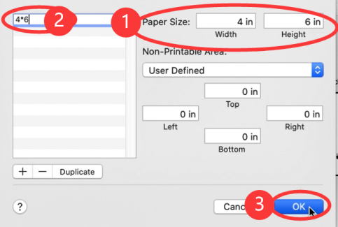 ⑥If the size you need not is not listed, then click "Manage Custom Sizes" -> input width, height and rename the size, then click "OK"