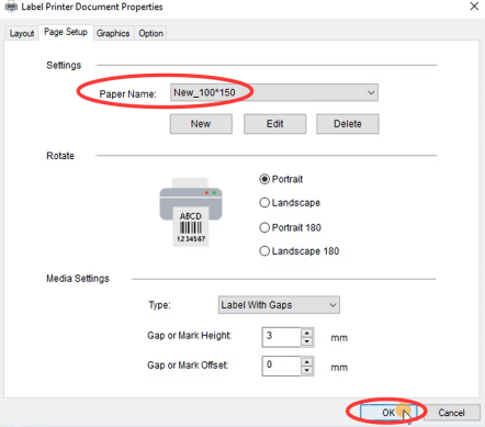 If the size you need not is not listed, then then click "New" to create a label size, then click "Ok"