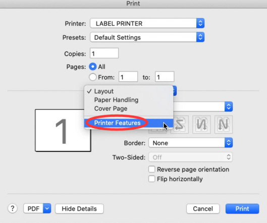 ⑦Click "Printer..." -> "Show Details" -> Select "Printer Features" in "Preview"