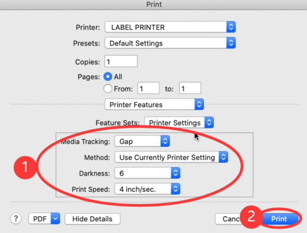 ⑧You can set up printer properties, such as "Media Tracking", "Darkness" and "Print speed".